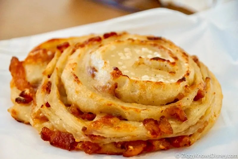 While we are enjoying the European side of Epcot’s World Showcase, why not introduce your LIttlest Taste buds to real-time French Cuisine. Located in the enchanting French Pavilion nestles Les Halles Boulangerie Patisserie, a really pretty words that roughly translate to, The Bread and Pastry Hall, this is a far cry away from your typical ham and cheese sandwich. In fact, I would wager a bet that there’s nothing “typical” about this vamped up Roule Lard and Fromage (aka-bacon and cheese roll) is what cheesy, bacon dreams are made of. They’re so good, you should just buy two., and at only $8.25, you can!